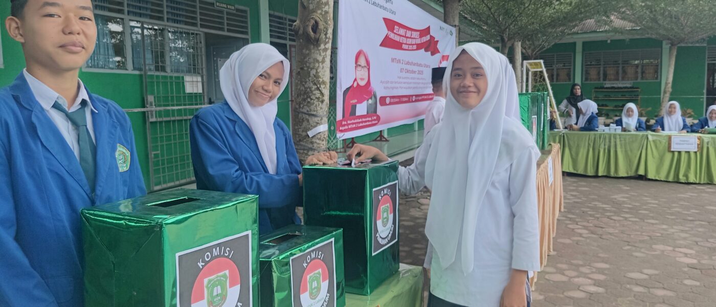 Damuli Pekan (Humas). Pemilihan Ketua dan Wakil Ketua OSIM MTs Negeri 2 Labuhanbatu Utara periode 2025/2026 acara ini berlangsung meriah dan penuh antusiasme dengan melibatkan peserta didik dan seluruh dewan guru. Pemilihan ketua OSIM dimulai dari jam 08.00.WIB sampai jam 12.00.WIB yang bertempat di halaman Madrasah. Selasa (7/10). Terdapat tiga kandidat Calon Ketua dan Wakil Ketua OSIM MTsN 2 Labuhanbatu Utara yaitu nomor urut 01 Syafira Ramadhani dan Lulu Nadira Azka, nomor urut 02 Johan Drian Yunus dan Rafi Dayniri serta nomor urut yang terakhir 03 Ananda Deti Pratama dan Haikal Azkhori